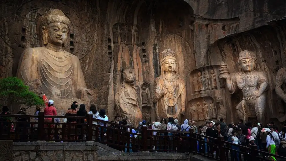 - Tham quan hang đá Long Môn (bao gồm xe điện)– kỳ quan Phật giáo cổ xưa trên Thế Giới – trải qua hơn 400 năm xây dựng. Nơi đây là kiệt tác chạm khắc tiêu biểu cho thời kỳ phát triển rực rỡ của Phật giáo Trung Quốc cổ đại. Trải qua hơn 400 năm xây dựng, tính đến nay, di tích này đã có hơn 1.500 năm lịch sử với hơn 10.000 tượng Phật, hang Tân Dương, hang Cổ Dương, chùa Phụng Tiên với tượng Phật Lư Sá cao 17 mét. Đoàn dùng bữa trưa tại nhà hàng.